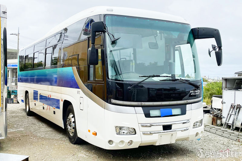 実は観光バスを買っちゃいました。 観光用?送迎用?ではなく、これからバスを改造して大型ショッピングカーを作るためです。通常、ショッピングカーと言えば2トントラックなどを改造するイメージなのですが、さすがにかりゆしウェアだと商品をたくさん積むこと出来ないので、一番大きいサイズの観光バスに決定したのです。