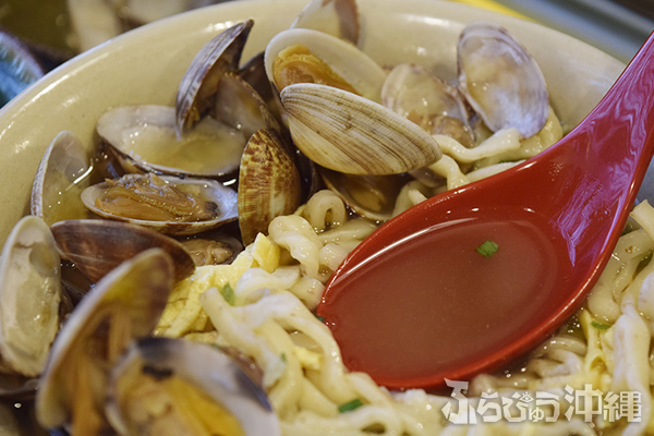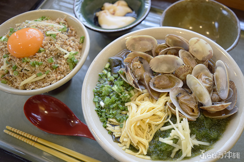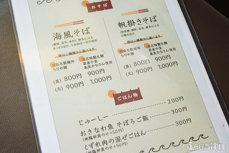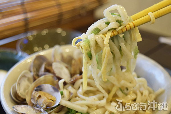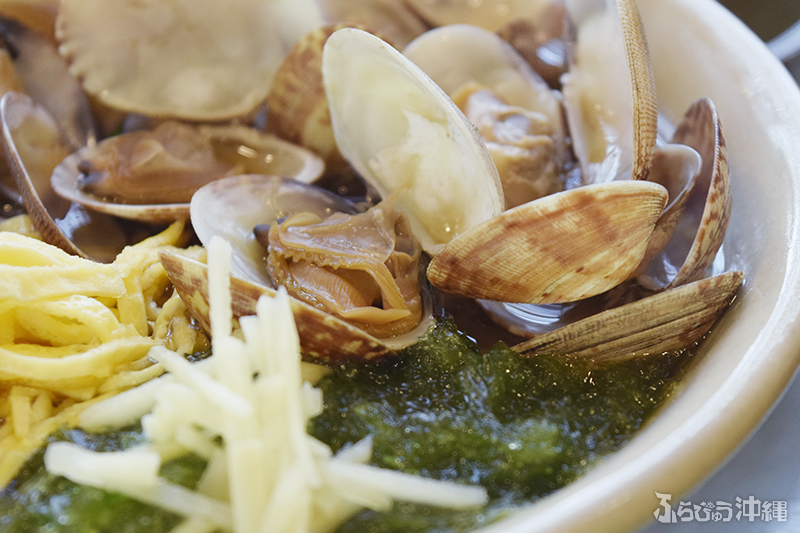 ここでしか食べられない特別な沖縄そば「海風そば800円〜(数量限定)」をいただく。肉は一切使わず、昆布・鰹・アーサ・アサリ・県産魚出汁で完成される味は、海の恵そのもの。優しい塩味のスープは魚の香りがしつつ、スッキリと体に染み込む。