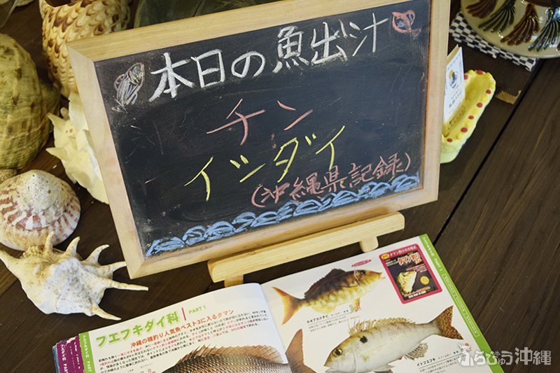 「化学調味料を不使用」とはよく見るが、「この魚を使用」と見せる沖縄そば店は珍しい。自ら釣りバカと公言する店主が釣ったイマイユ(鮮魚)を、スープの仕上げに絶妙なバランスで加えており、これがまたゆっくりスープを飲み干す時にフワッと感じる、主張しすぎない感じも素晴らしい!店内にはその日の魚が紹介され、撮影の日はどうやら店主がFacebookでも紹介した、県記録の大きなイシダイが入っているそうだ、ラッキー!