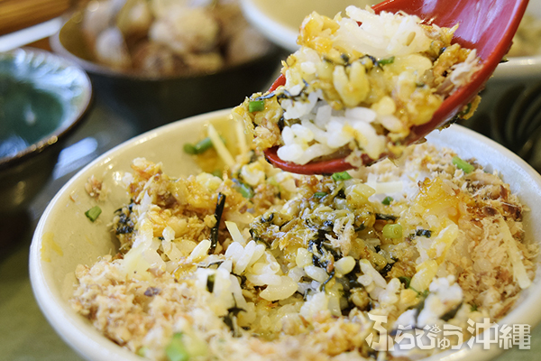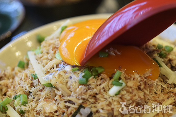 定番ジューシーも良いが「おきなわ魚 そぼろご飯300円」に、海風そばスープをかけてシメにする裏技を教えてもらったので挑戦!まずはそのままひと口、生ふりかけ風の味を楽しみトッピングした地鶏卵黄を混ぜる…、これは確実に止まらない系ご飯だ。さらにスープをかけると、これまで関わった素材たちの味が混ざり合い、美味しさを重ねていく、止まらない!