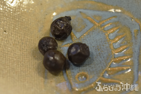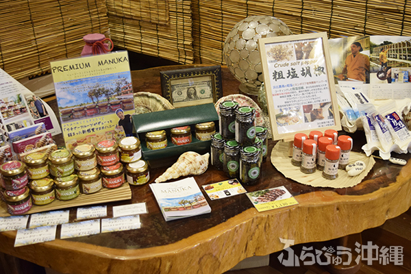 「アクセントに」と出してくれたのは生胡椒の塩漬け。ご飯にのせて食べれば口の中で弾け、一気に大人の味にしてくれ、またご飯がすすむ。この生胡椒の塩漬けはじめ、地元発信アイテムが店内に並んでいるので、見るのも楽しい!また「帆掛きそば」で使われている器は全て「良い風を吹かせる」をテーマに製作された、やちむん作家・賀数郁美氏の作品。