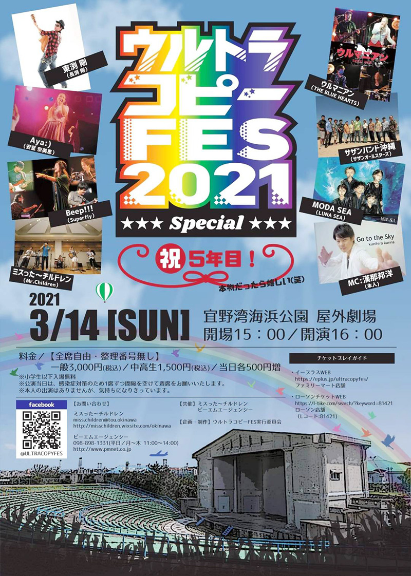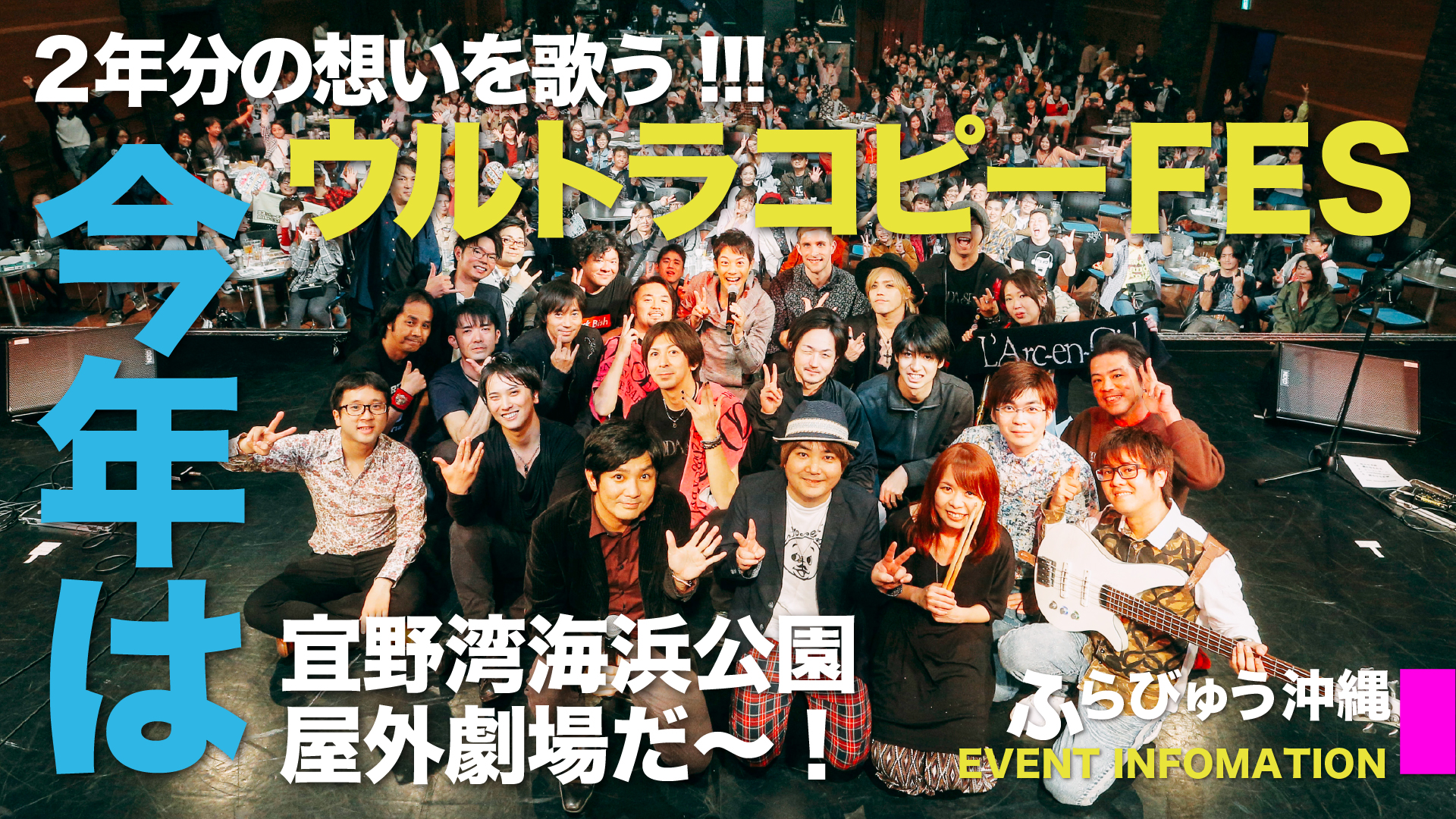 ミスチル!サザン!ブルハ!青春の記憶にはいつも名曲が寄り添う。そんな名曲の数々を歌声、演奏、見た目(?)も見事にカバーしたコピーバンドたちの祭典「ウルトラコピーFES」が、今年はなんと宜野湾海浜公園屋外劇場と、開放感溢れる野外ステージで開催される。昨年は緊急事態宣言の目前が開催日だったため、イベント自体を中止にと苦渋の決断。今年まで温められたスタッフ・出演者たちの想いは熱く燃えている!